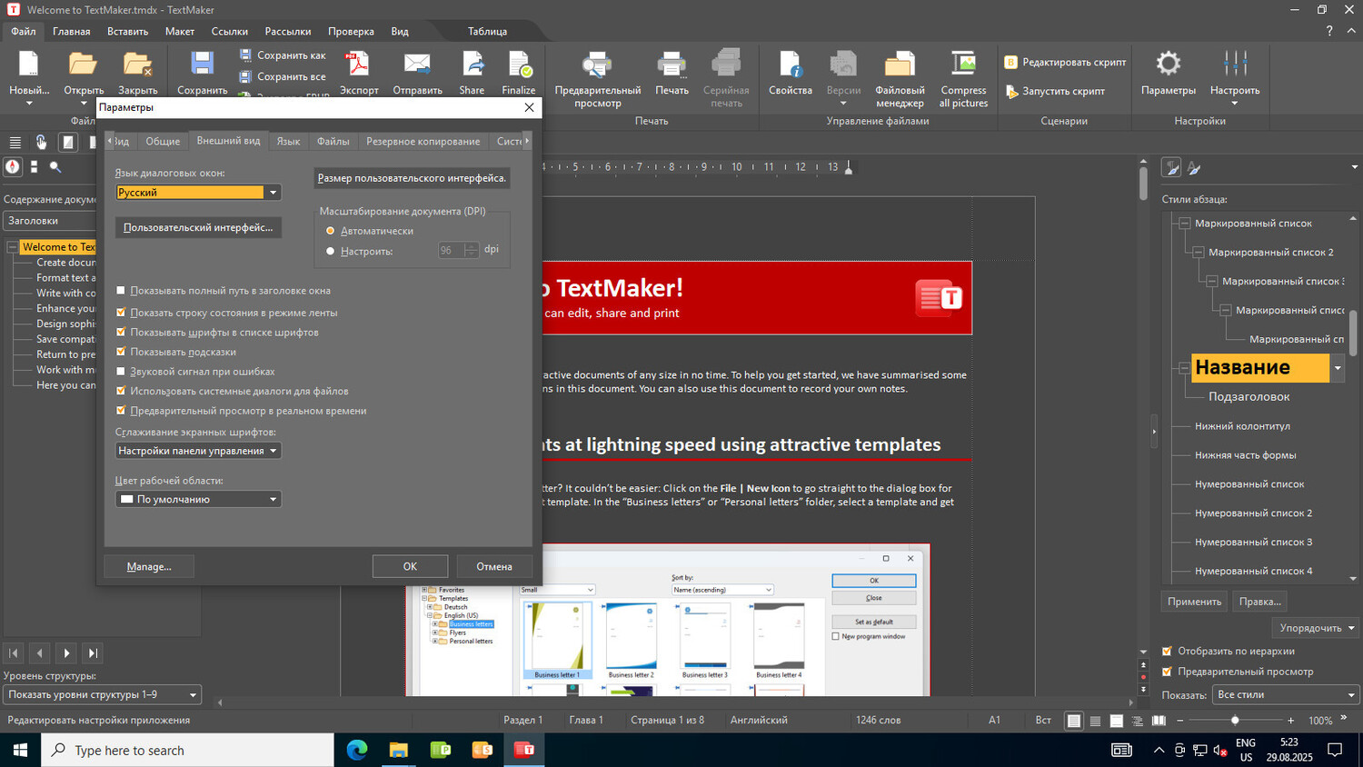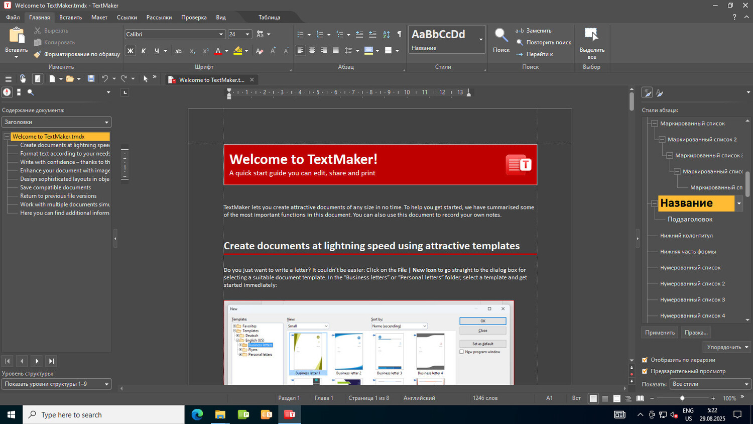 TextMaker Для проверки немецкой орфографии и грамматики используется последняя версия Duden Korrektor. Новая функция анализа стиля текста. TextMaker теперь напрямую интегрирован с системой управления библиографической информацией Zotero, что значительно упрощает создание научных статей. Автоматическое добавление на страницы меток линии сгиба гарантирует получение конверта нужного размера. Большое количество новых встроенных шаблонов документов упрощает оформление документов Две настраиваемые боковые панели помогают повысить скорость работы. Новая боковая панель повышает удобство поиска по документам и просмотра результатов поиска. Миниатюры страниц на боковой панели облегчают навигацию по большим документам. TextMaker теперь поддерживает файлы XLSX и PMDX в качестве источников данных для почтовых рассылок. TextMaker теперь поддерживает использование обычных и концевых сносок в одном документе, Word-совместимые многостраничные концевые сноски, перекрестные ссылки на заголовки.